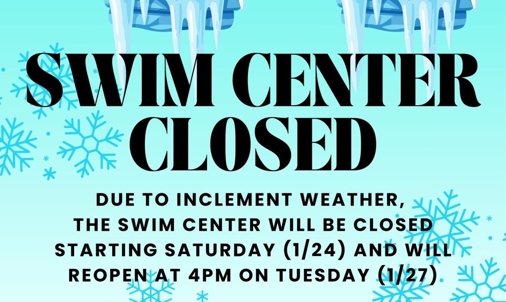 Due to the winter storm warning and expected freezing temperatures, the Swim Center will be closed Saturday, Jan 24 through the morning session on Tuesday, Jan 27. We will plan to open for the afternoon session on Tuesday at 4pm, weather permitting.