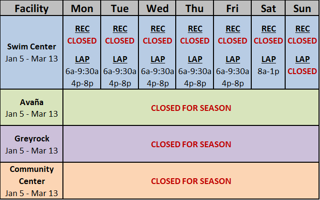 Hours and closure dates are subject to change depending on weather, usage, and staff availability.